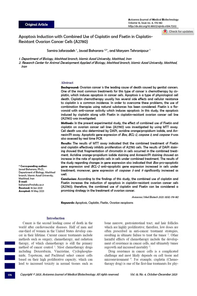 Background: Ovarian cancer is the leading cause of death caused by genital cancers. One of the most common treatments for this type of cancer is chemotherapy by cisplatin, which induces apoptosis in cancer cells. Apoptosis is a type of physiological cell death. Cisplatin chemotherapy usually has several side effects and cellular resistance to cisplatin is a common incidence. In order to overcome these problems, the use of combination therapies using natural substances has been considered. Fisetin is a flavonoid with anti-cancer activity which induces apoptosis. In this study, the apoptosis induced by cisplatin along with Fisetin in cisplatin-resistant ovarian cancer cell line (A2780) was investigated. Methods: In the present experimental study, the effect of combined use of Fisetin and cisplatin on ovarian cancer cell lines (A2780) was investigated by using MTT assay. Cell death was also determined by DAPI, acridine orange/propidium iodide, and Annexin/PI assay. Apoptotic gene expression of Bax, BCL-2, caspase 3, and caspase 9 was also assessed by real time PCR. Results: The results of MTT assay indicated that the combined treatment of Fisetin and cisplatin effectively inhibits proliferation of A2780 cells. The results of DAPI staining showed that fragmentation of chromatin in cells occurred in the combined treatment. Acridine orange-propidium iodide staining and Annexin/PI staining showed an increase in the rate of apoptotic cells in cells under combined treatment. The results of the study regarding changes in gene expression also indicated that Bax pro-apoptotic gene expression and BCL-2 anti-apoptotic gene expression increased in cells under treatment; moreover, gene expression of caspases 3 and 9 significantly increased as well. Conclusion: According to the findings of this study, the combined use of cisplatin and Fisetin increases the induction of apoptosis in cisplatin-resistant ovarian cancer cells (A2780); therefore, the combined use of cisplatin and Fisetin can be considered a promising strategy in the treatment of ovarian cancer.