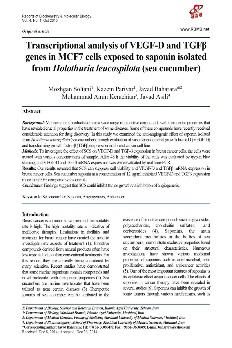 Transcriptional analysis of VEGF-D and TGFβ genes in MCF7 cells exposed to saponin isolated from Holothuria leucospilota (sea cucumber)