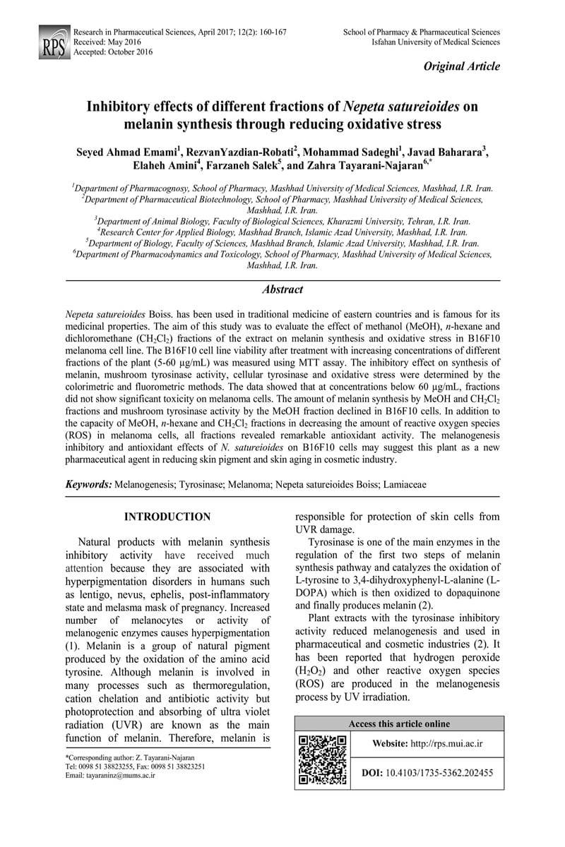 Inhibitory effects of different fractions of Nepeta satureioides on melanin synthesis through reducing oxidative stress