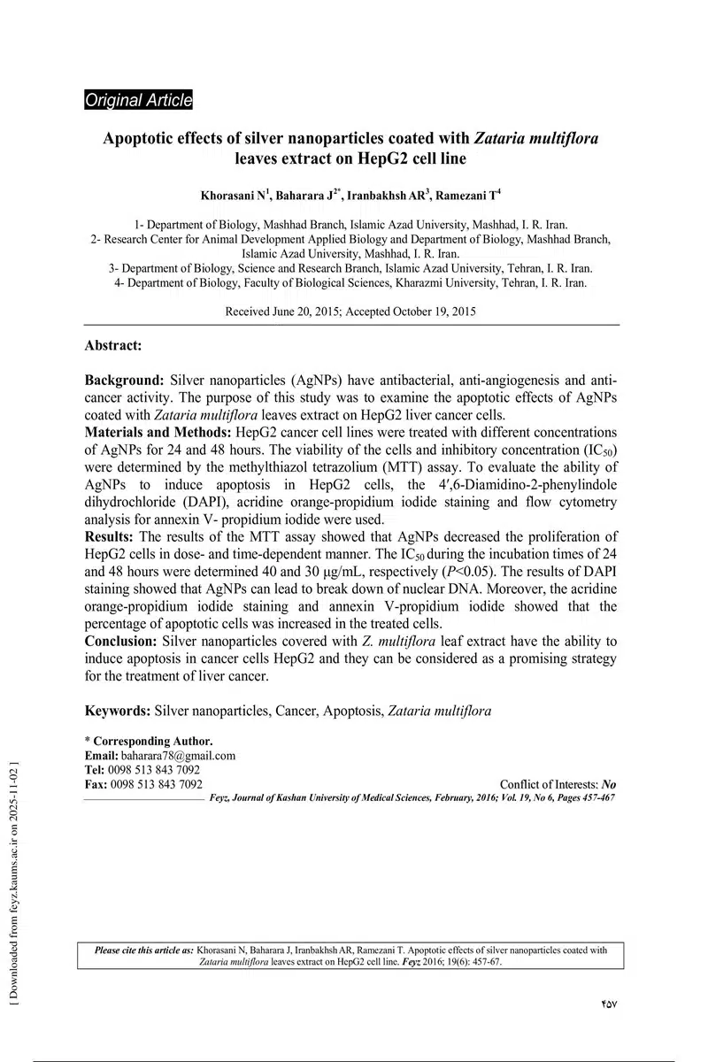 Apoptotic effects of silver nanoparticles coated with Zataria multiflora leaves extract on HepG2 cell line