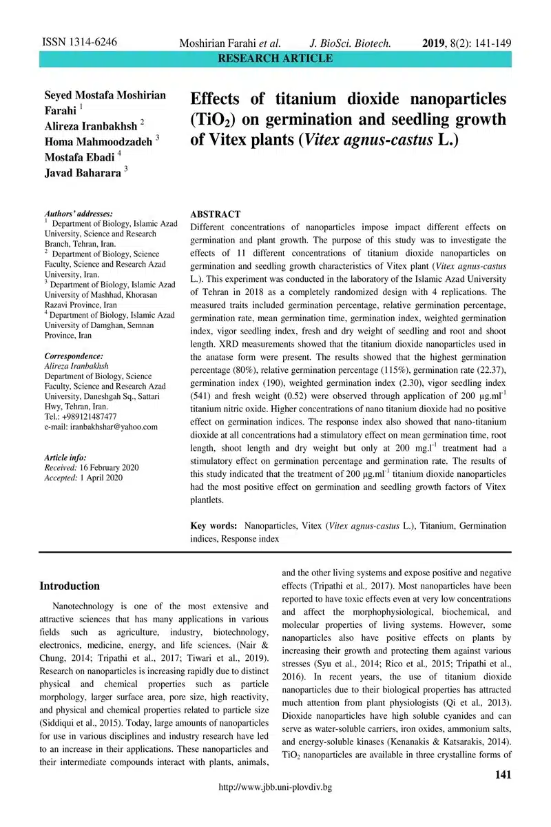 Effects of titanium dioxide nanoparticles (TiO2) on germination and seedling growth of Vitex plants (Vitex agnus-castus L.)